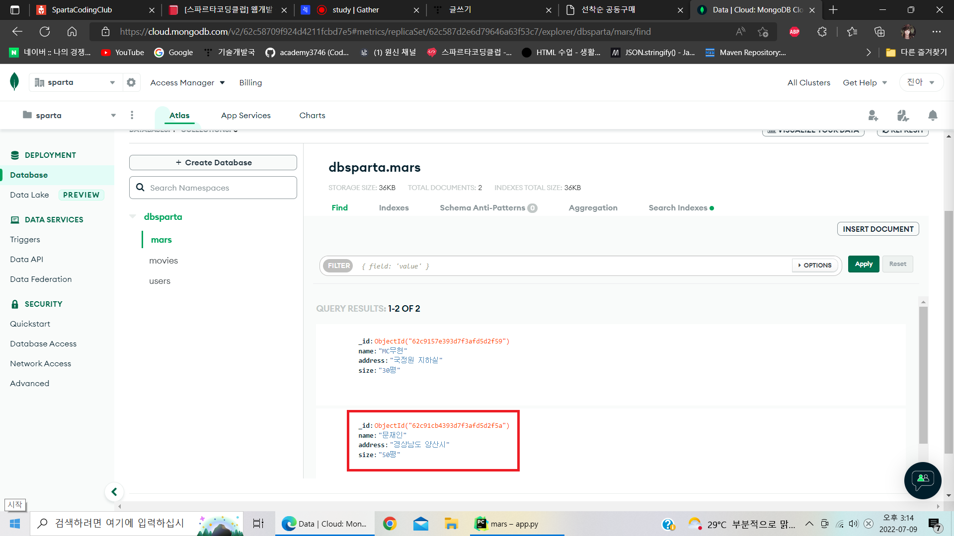 그 값들을 하나씩 컬럼에 밀어넣어 주기 위해서 db.TABLE.insert_one(doc) 라는 함수를 쓰고 있다.