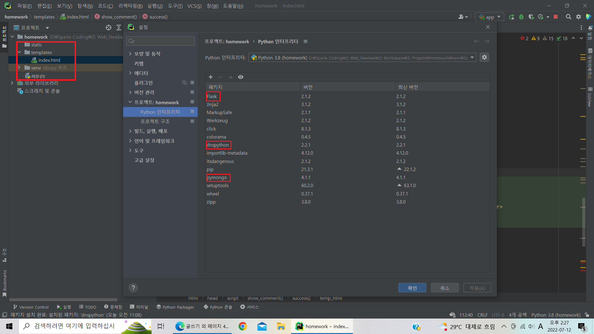 플라스크 서버와 DB서버를 연결해주기 위하여 pymongo 패키지를 임포트 해준 것이다.