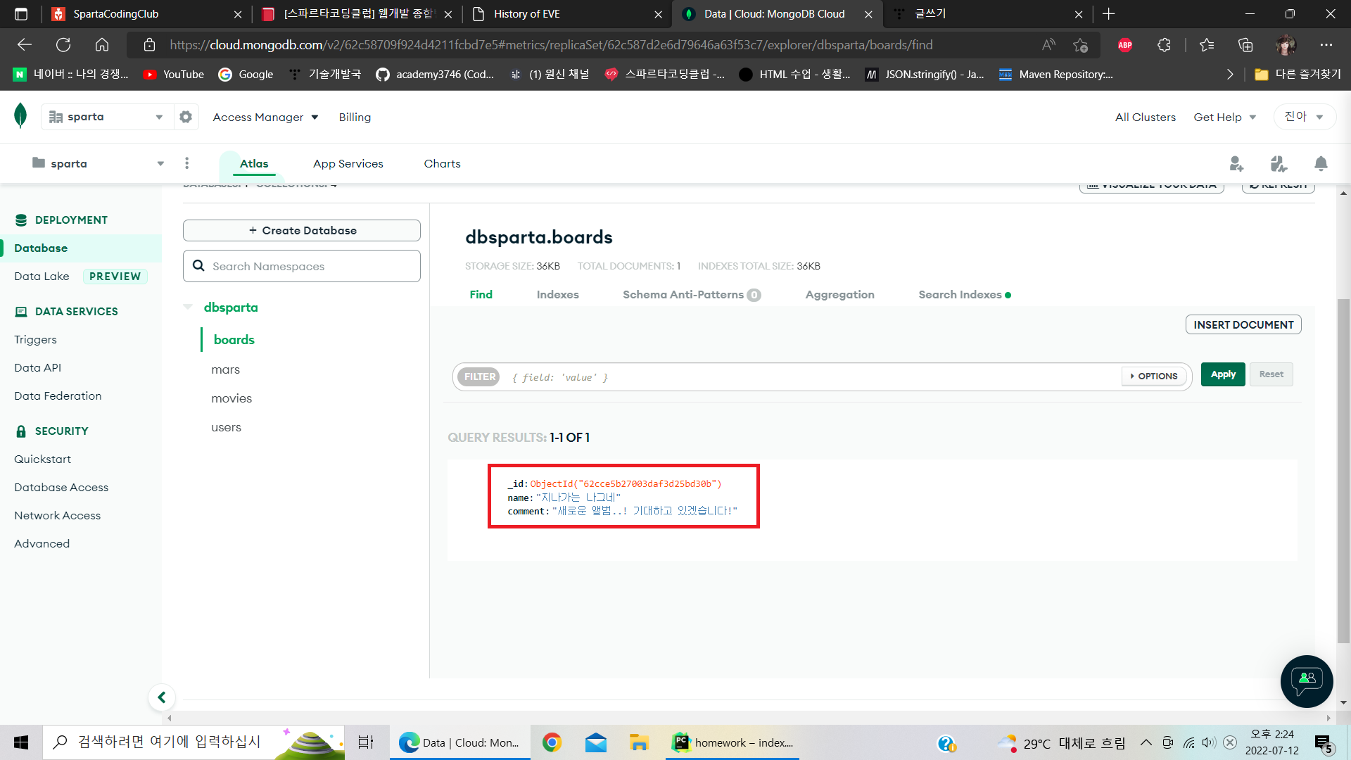 클라이언트의 요청대로 name과 comment의 데이터를 DB서버에 요청했고..