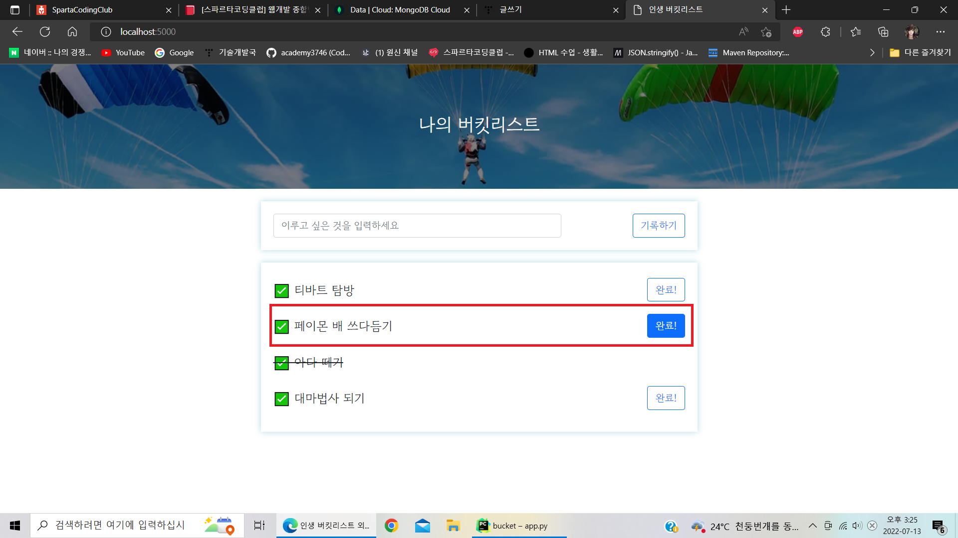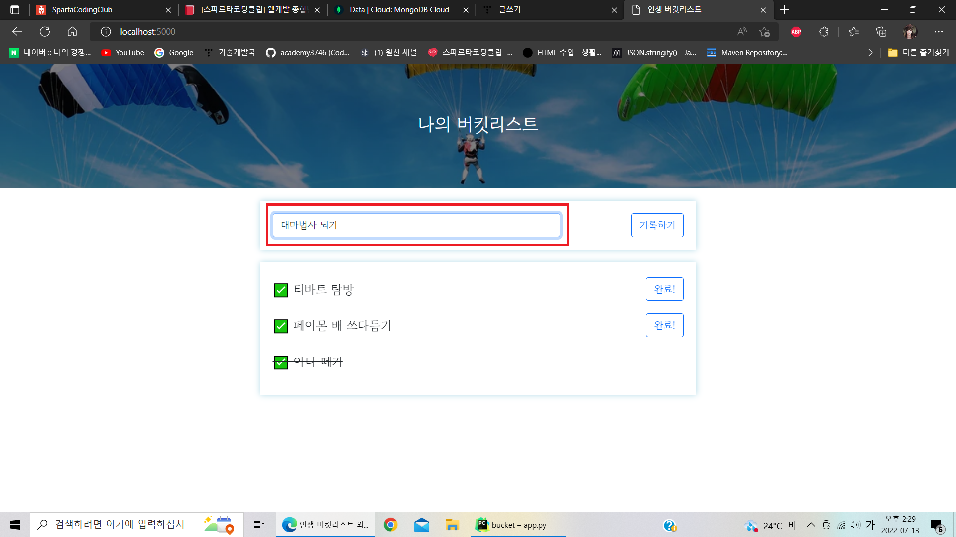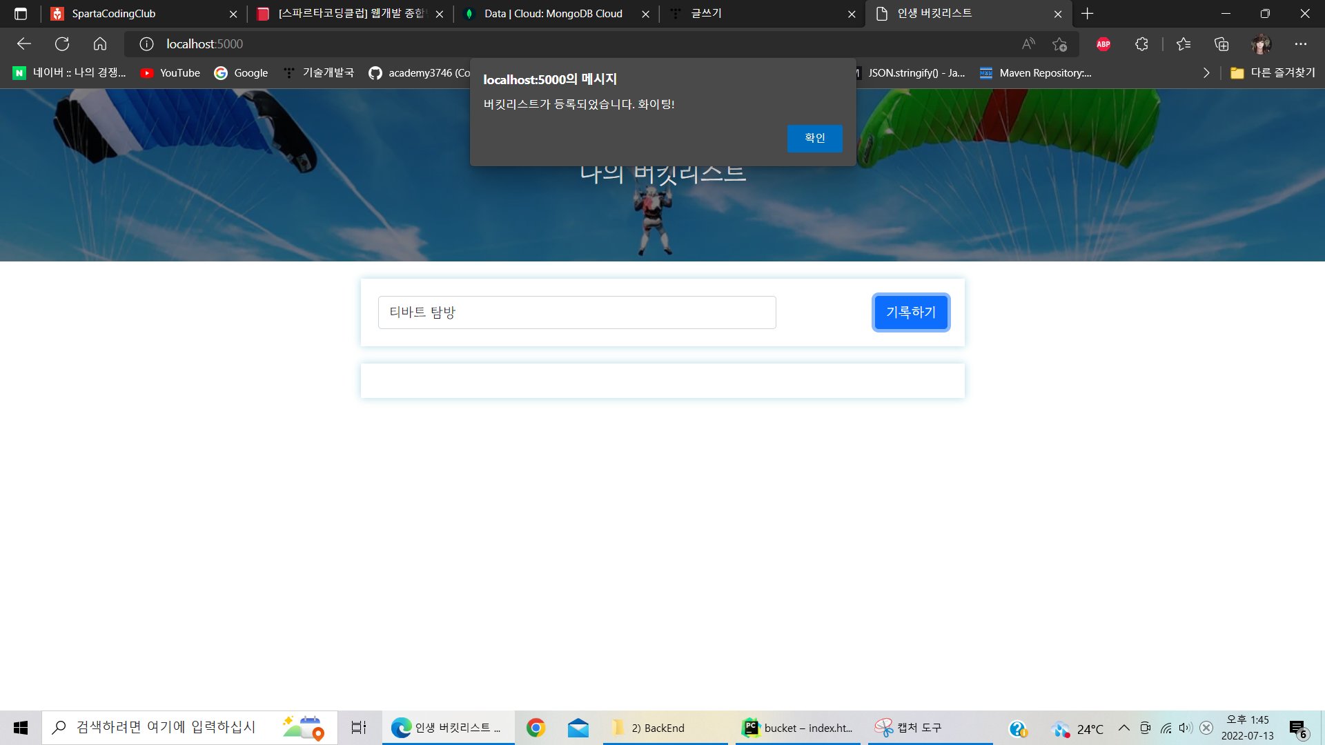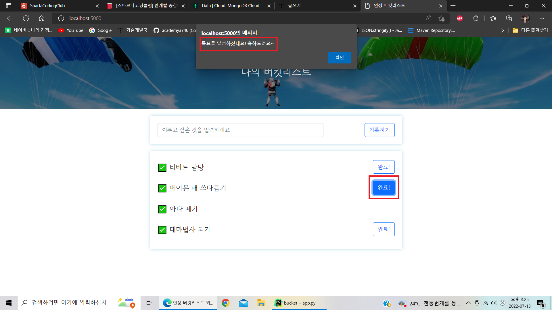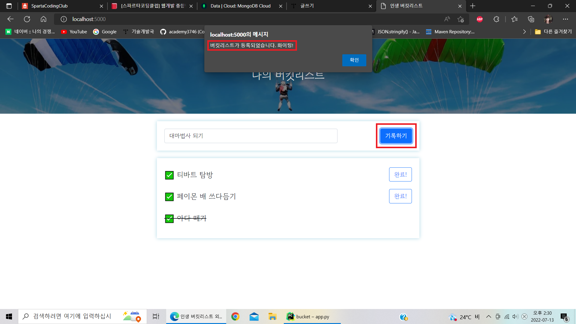 return jsonify({'msg': '버킷리스트가 등록되었습니다. 화이팅!'})
