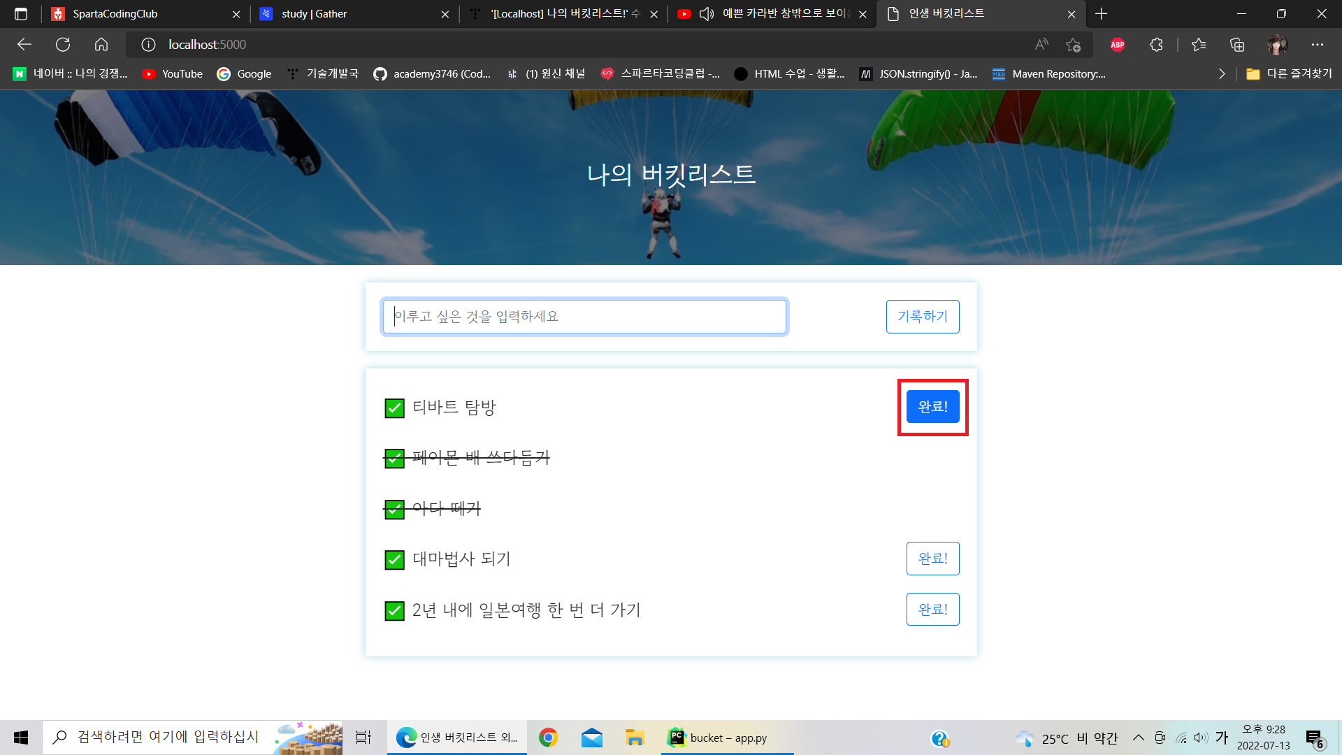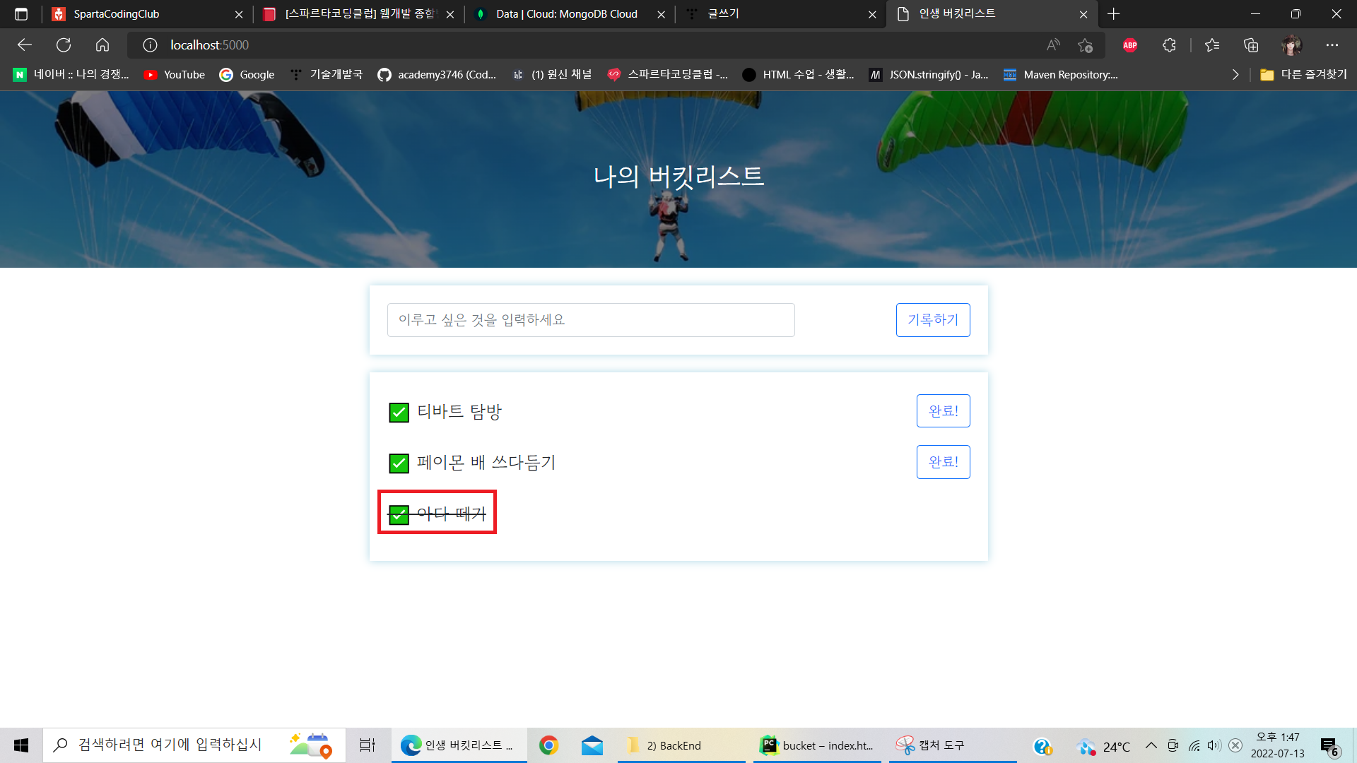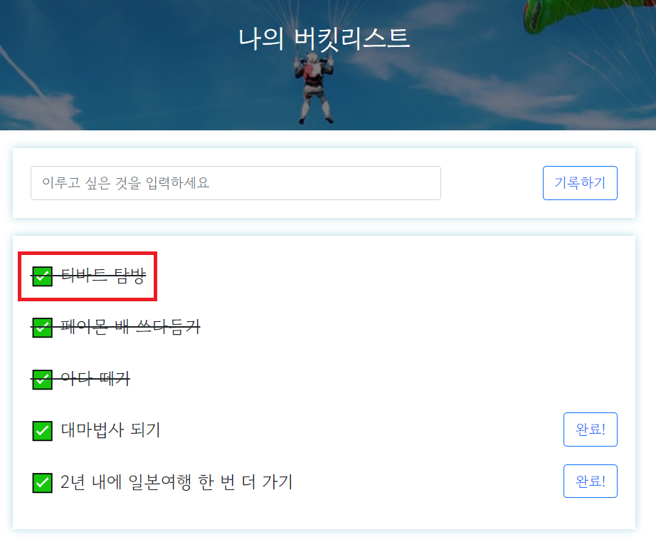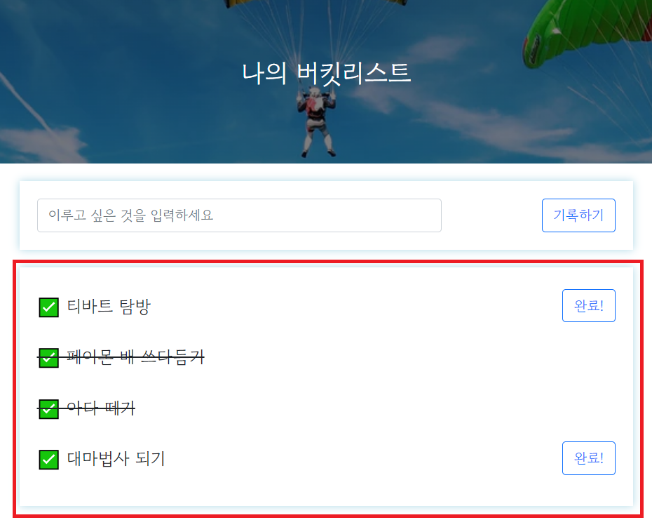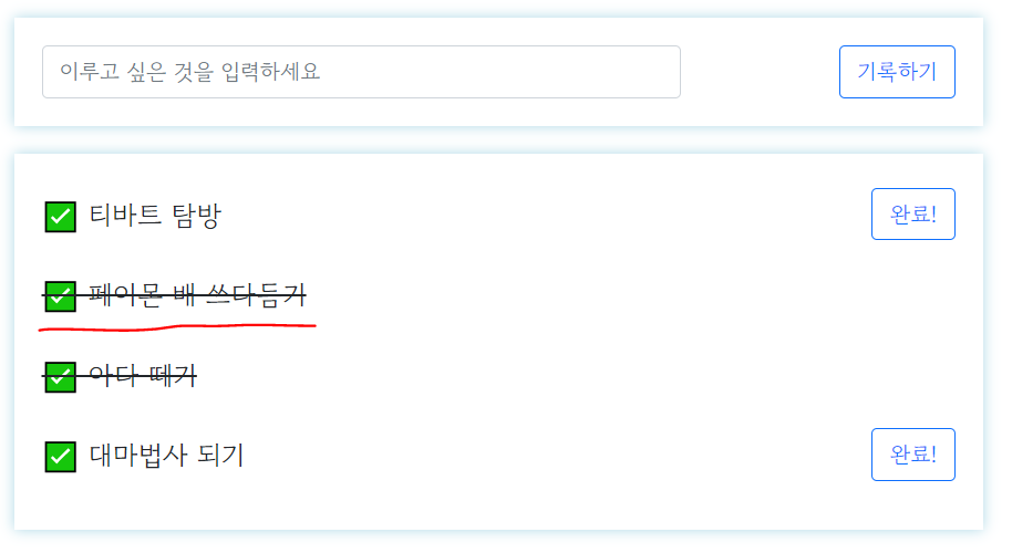 소원이 성취 되었다면 done 값이 1로 업데이트 되면서, 화면단에는 취소선이 그어질 것이다.
