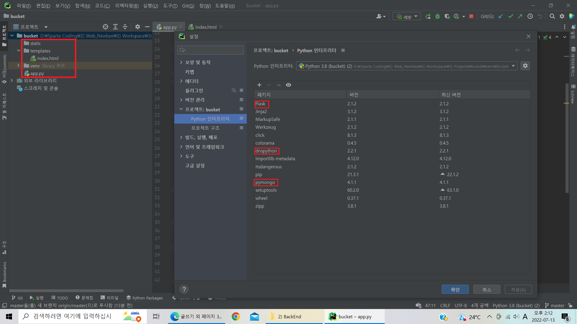 이전에 임포트 해준대로 flak와 pymongo 패키지를 모두 써먹고 있지?