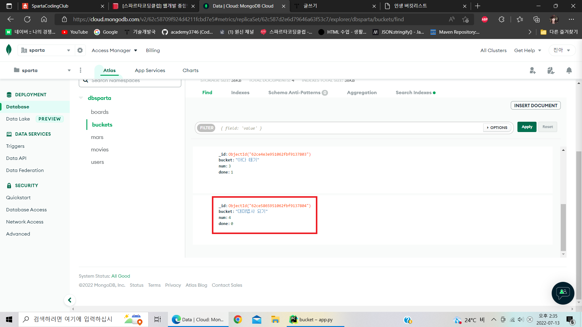 조회한 모든 데이터를 배열 형식으로 bucket_list 변수에 저장하고 있네?